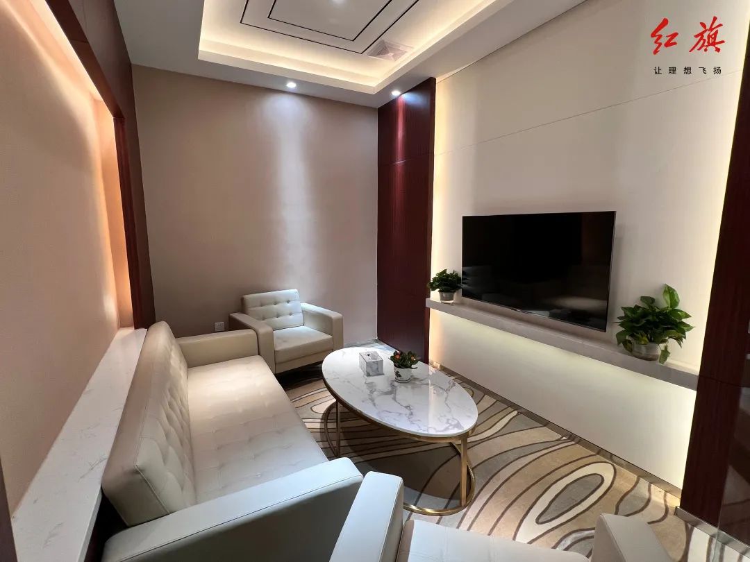 功能分为新车展示区、开放洽谈区、茶歇区、洽谈室、客户休息区、VIP室等。展厅高大、通透、明亮,配有宽大LED屏和芬芳馥郁的香氛系统,步入展厅就能感受到中国第一“新高尚品牌”的豪华和底蕴;茶歇区位于落地玻璃幕墙后,多功能水吧台位于其间,为客户提供视野宽阔、舒适惬意的休憩环境;二楼客户休息区配备宽大沙发和影音娱乐设备,客户还可以通过数字车间电视实时关注车间维修保养情况,方方面面体现着红旗品牌“极致服务”的理念。