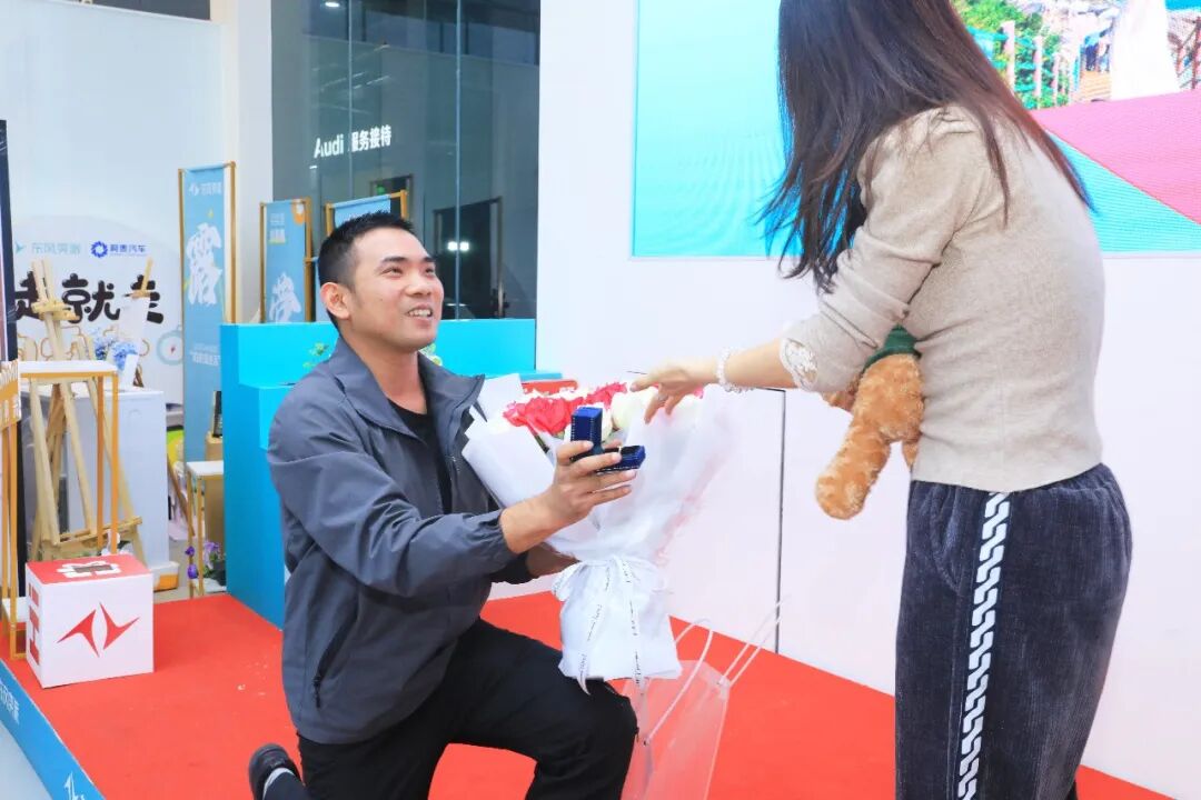 话音刚落,何先生单膝跪地献上戒指,女友含泪点头应允,现场掌声与欢呼声此起彼伏。门店负责人特意送上定制情侣礼盒,为这对因奕派结缘的恋人送上诚挚祝福。这一温馨瞬间,也让东风奕派 “不止于出行,更连接温情” 的品牌温度愈发凸显。